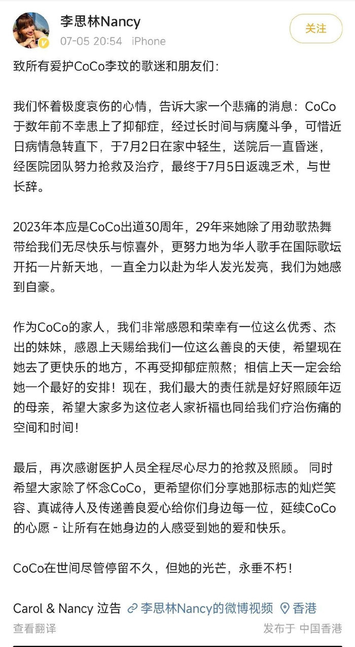 2023年7月6日,李玟的姐姐李思林发布了讣告。